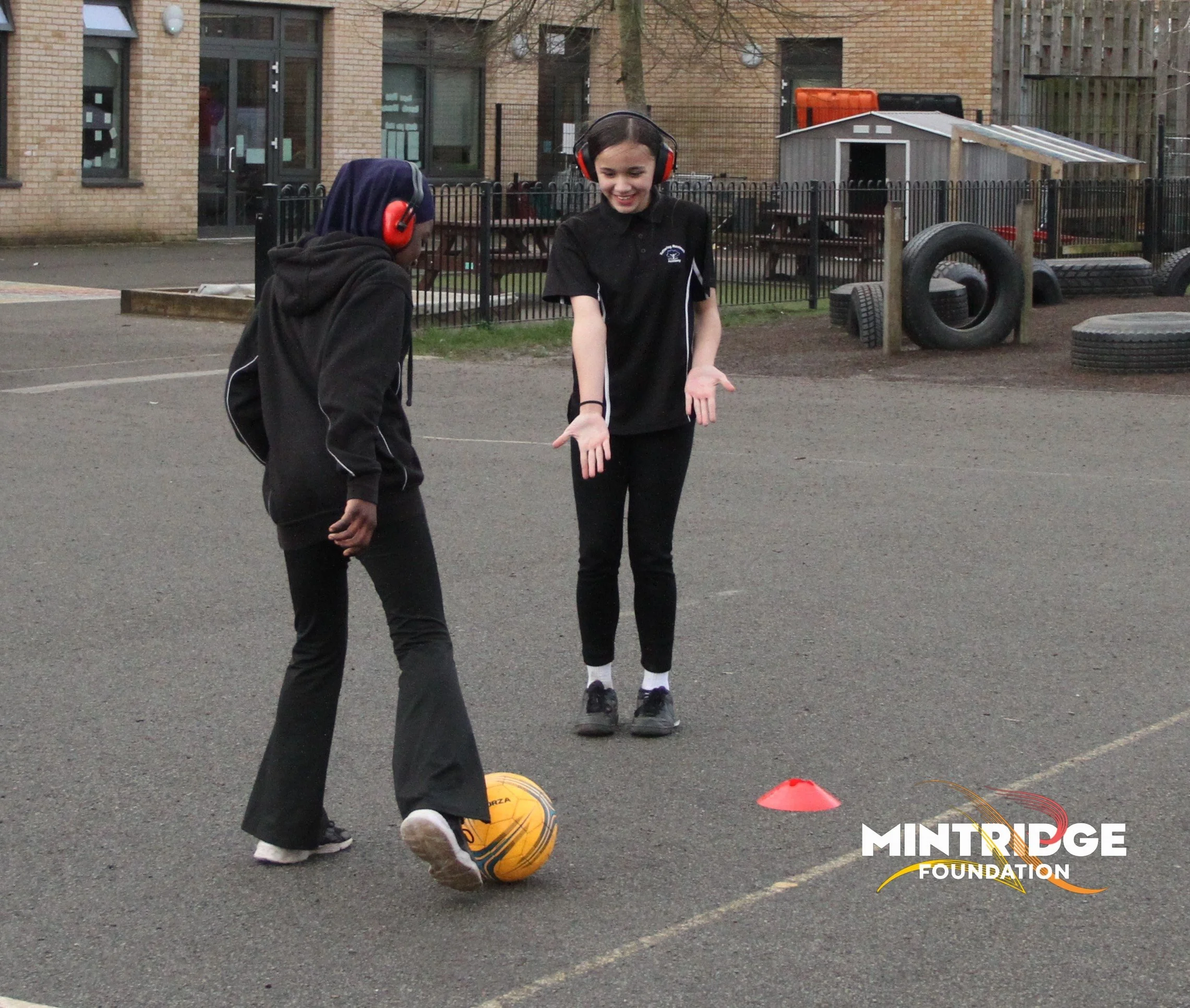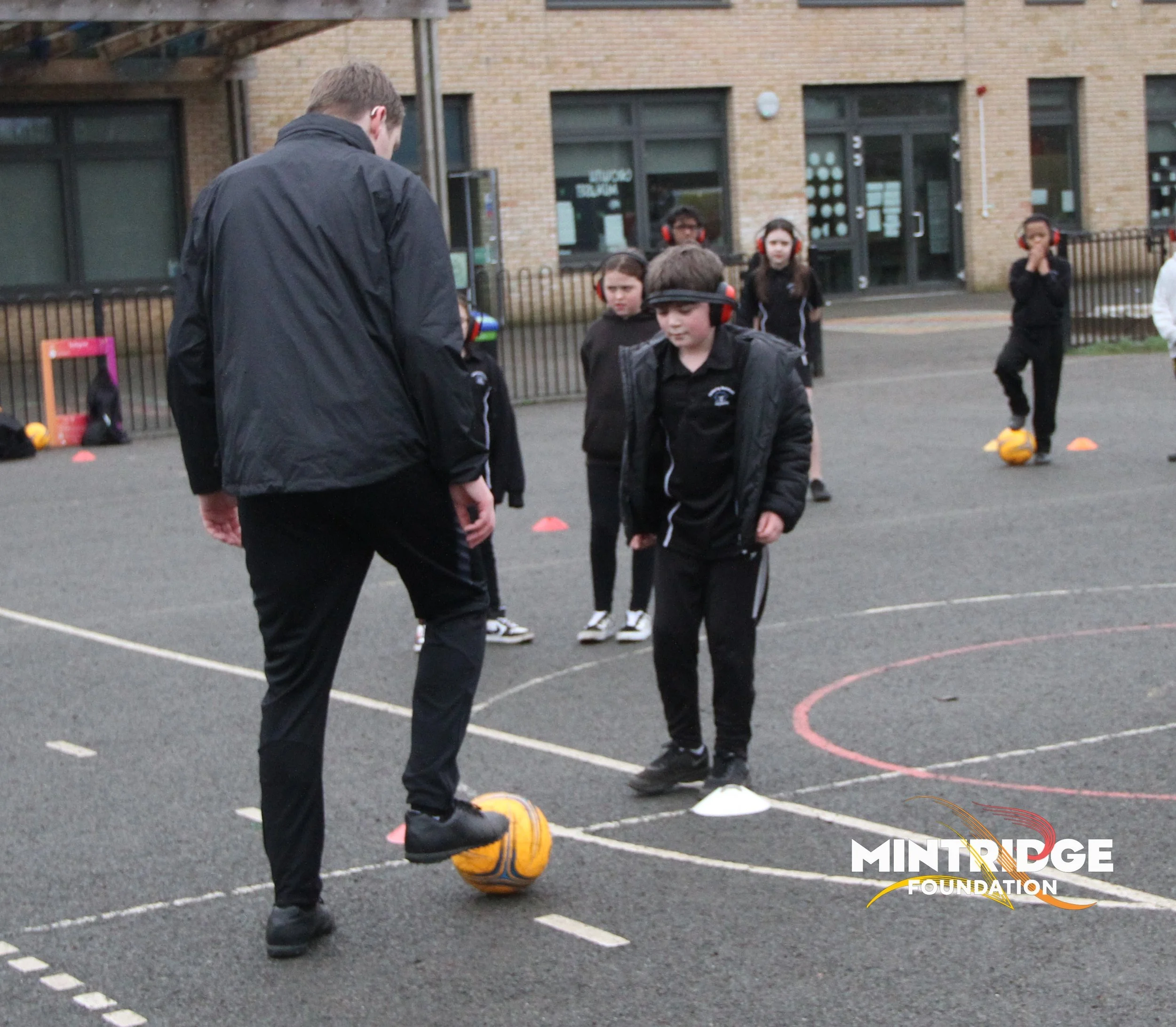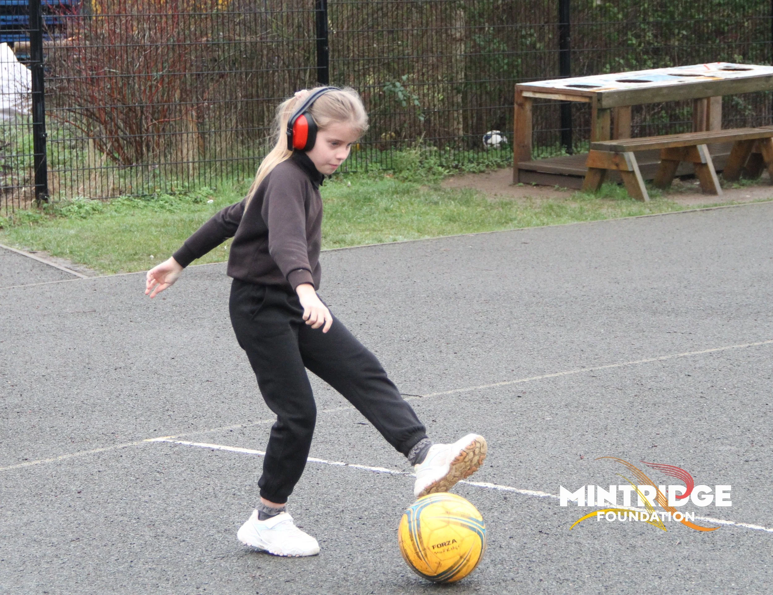 Following the assembly, Aileen and Fil delivered football coaching sessions for Years 5 and 6, focusing on key skills, teamwork, and communication. Half of the class wore ear defenders to encourage sharper visual focus, clear signalling and working together while the other half were with Aileen focusing on core skills but using more traditional communication.