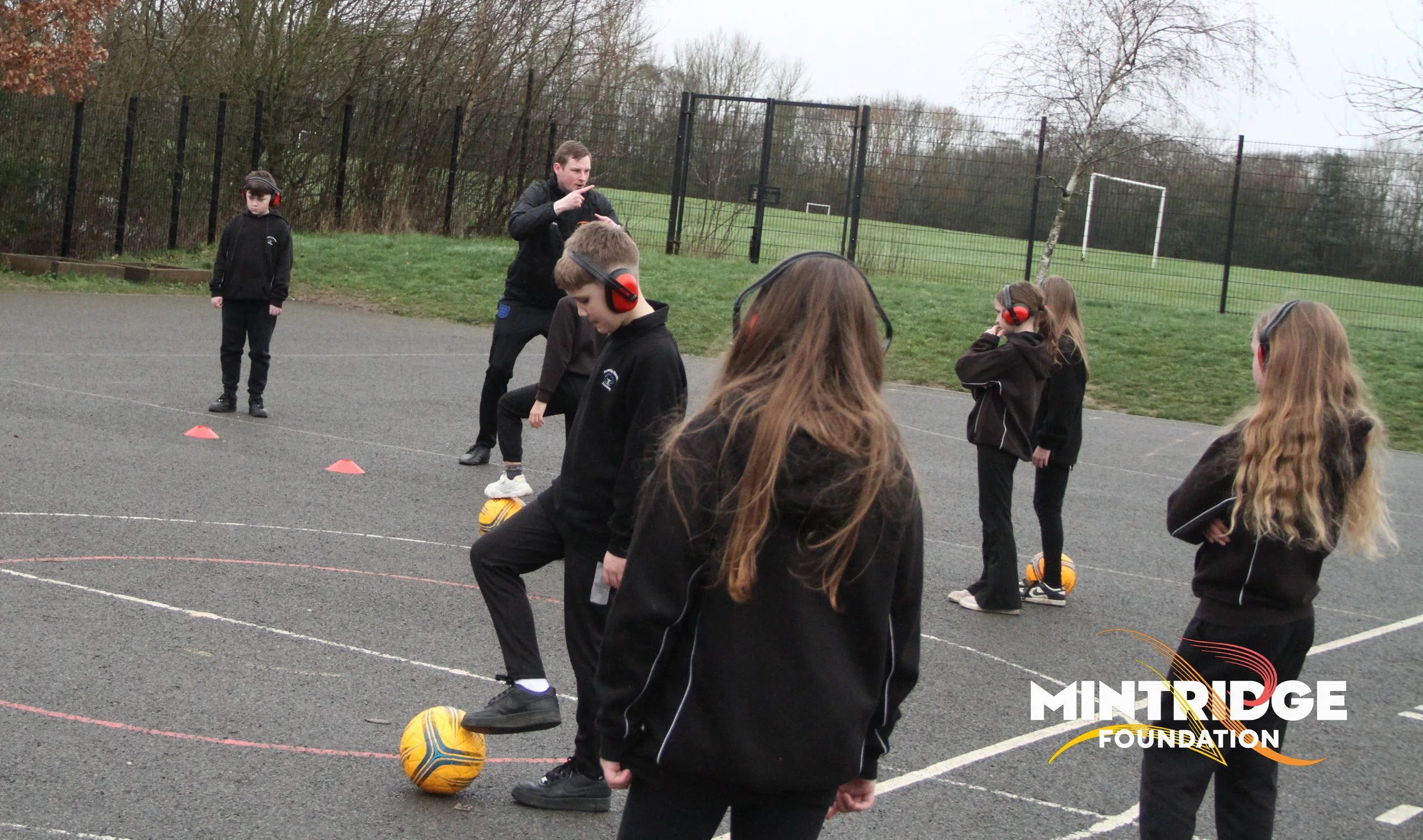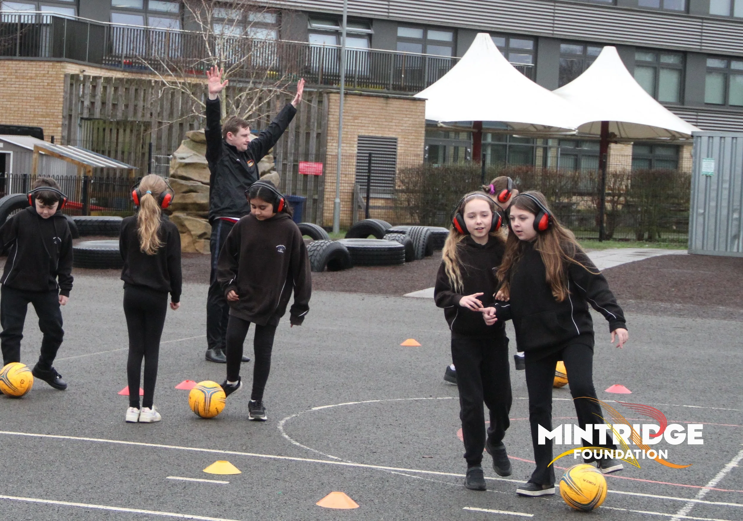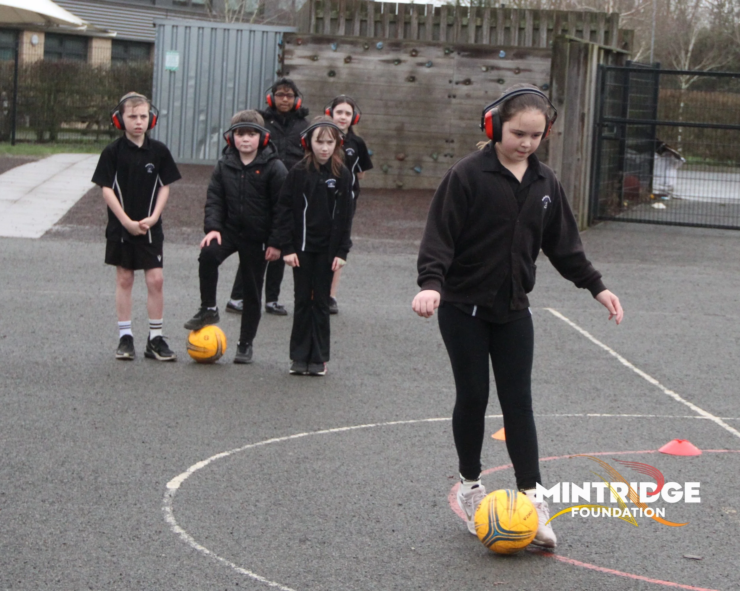 Following the assembly, Aileen and Fil delivered football coaching sessions for Years 5 and 6, focusing on key skills, teamwork, and communication. Half of the class wore ear defenders to encourage sharper visual focus, clear signalling and working together while the other half were with Aileen focusing on core skills but using more traditional communication.